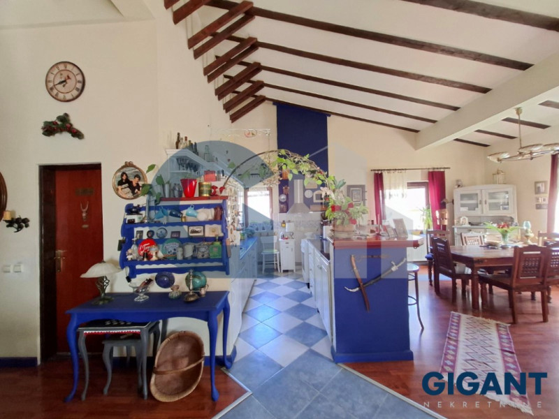 U dnevno-trpezarijsko-kuhinjskom delu, koji zajedno sa terasom čini jedinstvenu vizuelnu celinu, ostavljena je visina do tavanice, što stvara bogat i ispunjen osećaj zaokruženog prostora.
