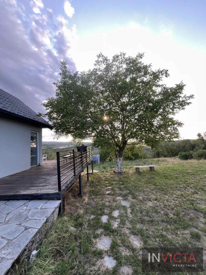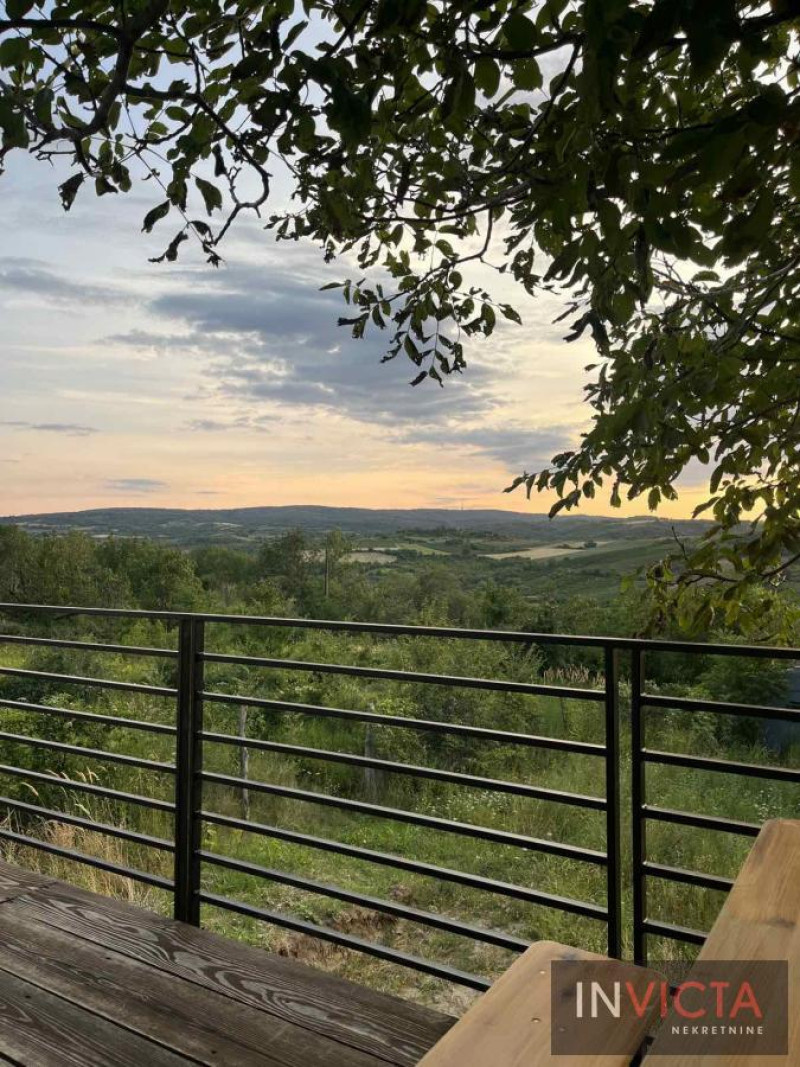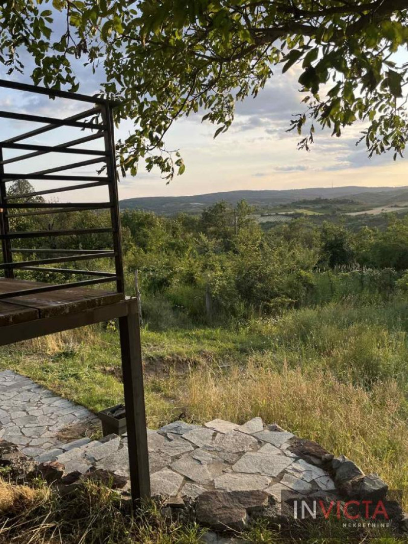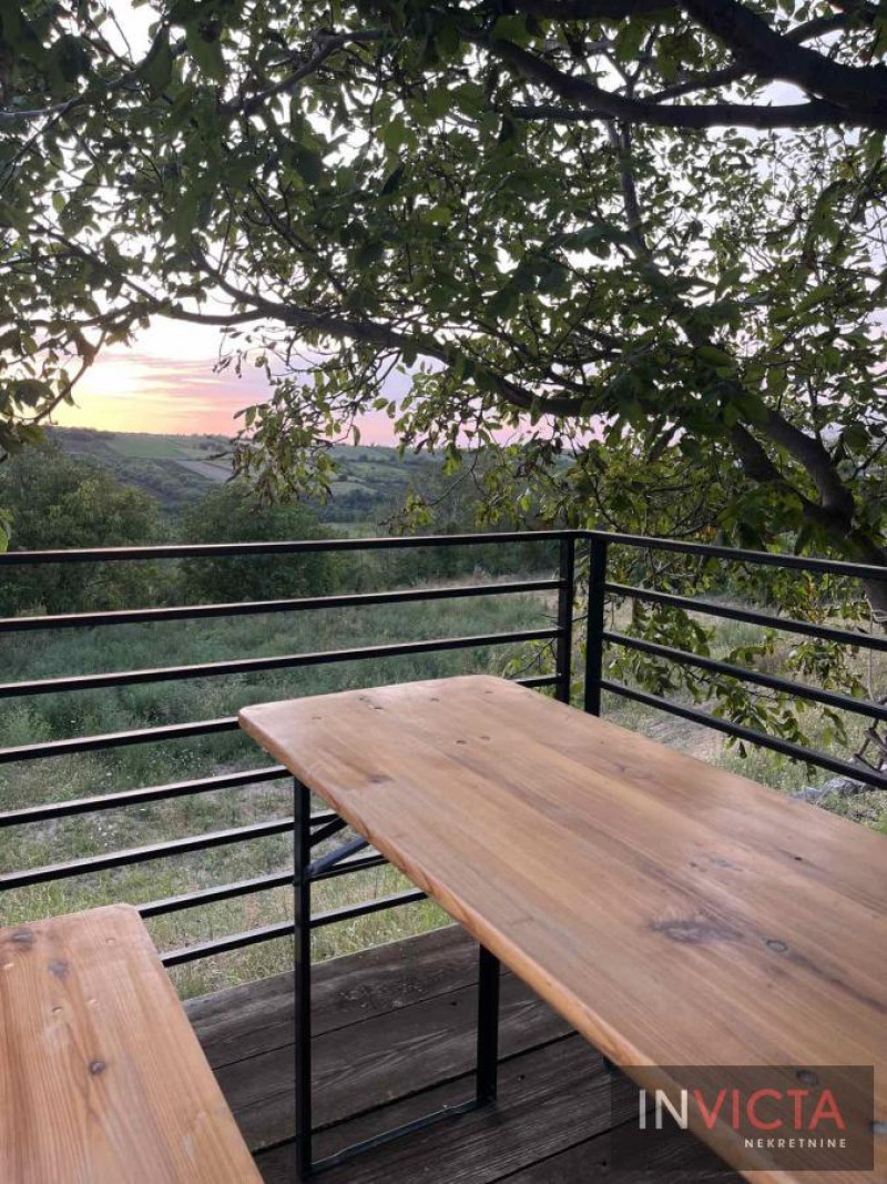 Novija, funkcionalna manja kuća-vikendica na potezu između Sremskih Karlovaca i Banstola,u prelepom prirodnom okruženju, sa prelepim pogledom na obronke Fruške Gore i na Dunav, izgrađena na velikoj parceli površine 2500m2. U gornjem nivou kuće je kupatilo sa tuš kadom i prirodnom venitlacijom, kuhinja u sklopu dnevnog boravka, te odvojena spavaća soba sa velikim staklenim poivršinama izlaskom na terasu, te prelepim pogledom. U donjem nivou je još jedna spavaća soba. Kuća je opasana prostranom terasom. Struja je uredno uvedena, ugrađena inventerska klima koja rešava grejanje tokom zimskog perioda., voda je rešena velikm rezervoarom za skupljanje kišnice.. Ozidana i dva odžaka sa mogućnošću ugradnje kamina. iBroj u Reg.posrednika 475.