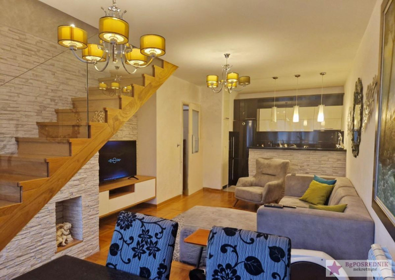 -donji nivo: ulazni hodnik, wc/kupatilo, spavaća soba. velika dnevna soba sa kuhinjom i trpezarijom, lođa.