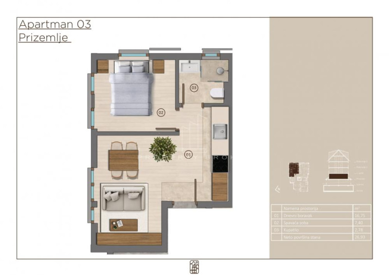 Stan se sastoji od: ulaznog hodnika, dnevno trpezarijskog dela sa kuhinjom, spavaće sobe i toaleta.