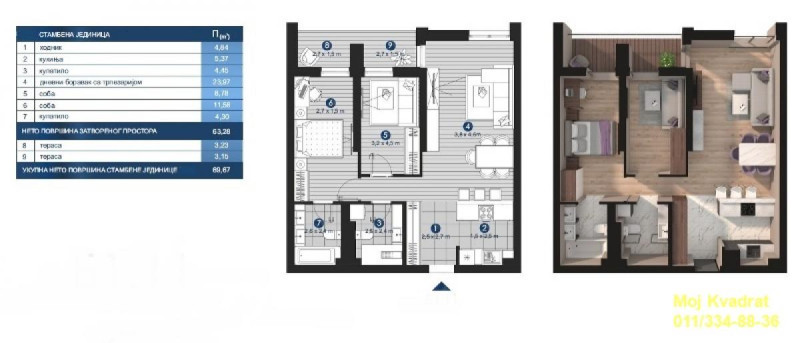 Sastoji se od ulaznog hodnika, dnevnog boravka sa kuhinjom i trpezarijom po principu open-space koncepta, dve spavaće sobe, kupatila, toaleta i terase.