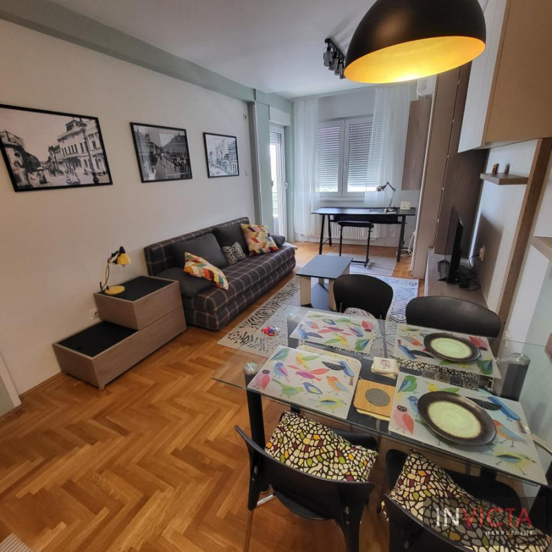 Izdaje se noviji, prelepo opremljen potpuno novim nameštajem i belom tehnikom,jednoiposoban stan na Grbavici, na Bul.Cara Lazara. Iz predsoblja je veza za sve prostorije i to: dnevni boravak sa kuhinjom i trpezarijom, izlazak na terasu, spavaća soba sa bračnim ležajem i garderoberom , ostava, kupatilo sa prirodnom ventilacijom i veš mašinom. Kuhinja opremljena štednjakom, mašinom za sudove. U ostavi je smešten vweliki frižider sa zamrzivačem. Stanarima je na raspolaganju i kompletno posuđe, posteljina, kao i usisivač , pegla i drugi kućni aparati. Odmah useljiv stan uz obavezan depozit. Kućni ljubimci isključeni. Broj u Reg.posrednika 2107.