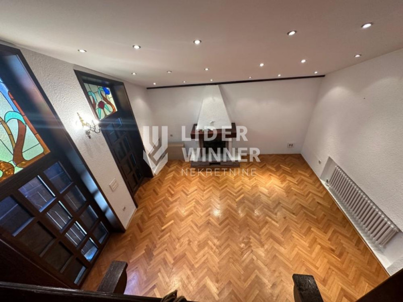 Kupatilom , prostran dnevni boravak sa kaminom i pogledom na malo dvorište od 26m2, trpezarije, kuhinje iz koje se izlazi u dvorište a u samom dvorištu je veća ostava.Takodje na ovom nivou se nalazi jedna soba. Iz ovog dela silazi se u garažu.