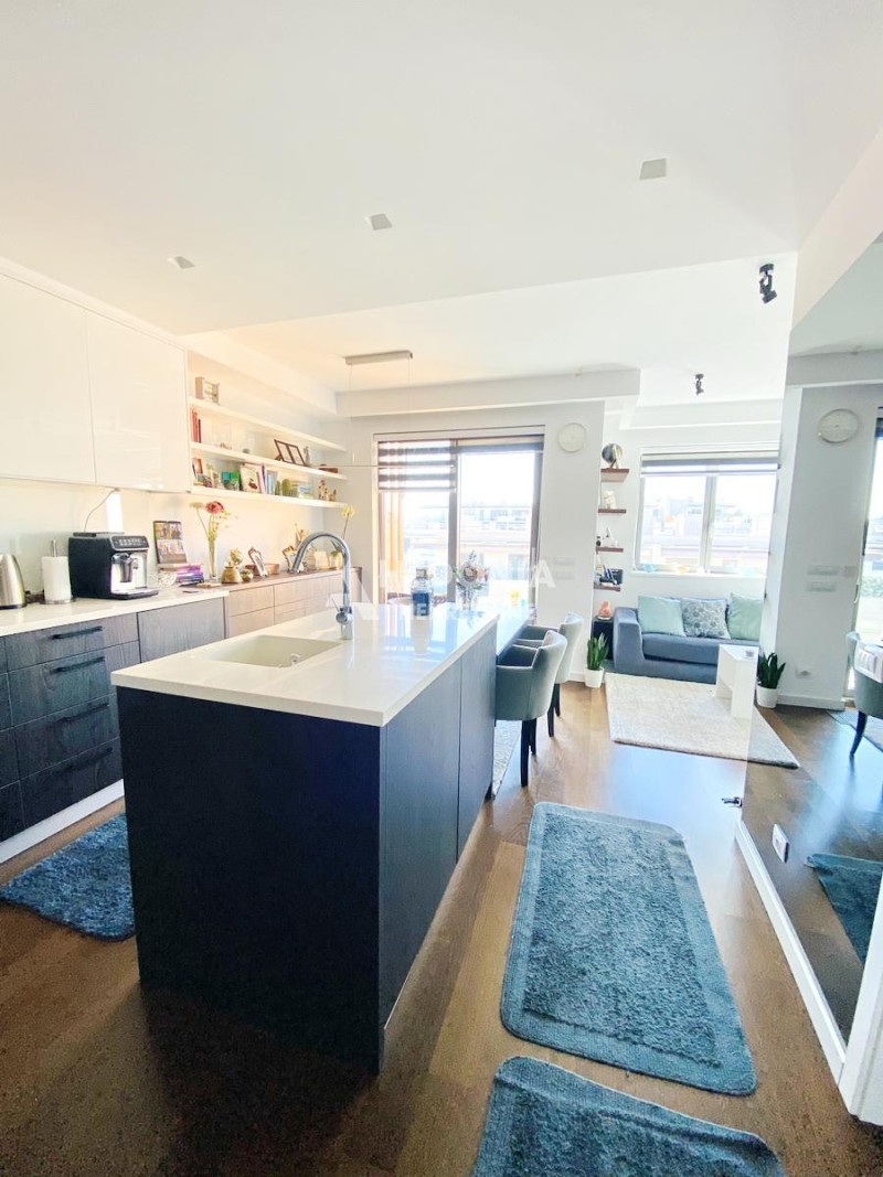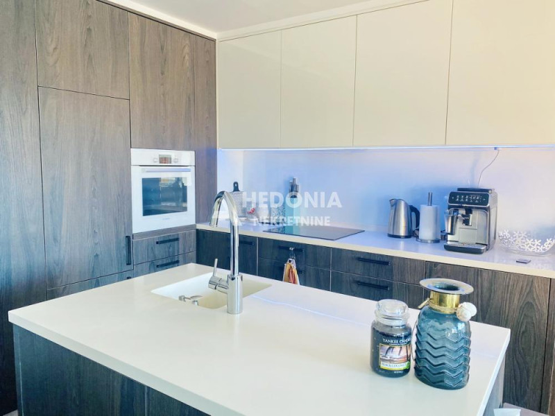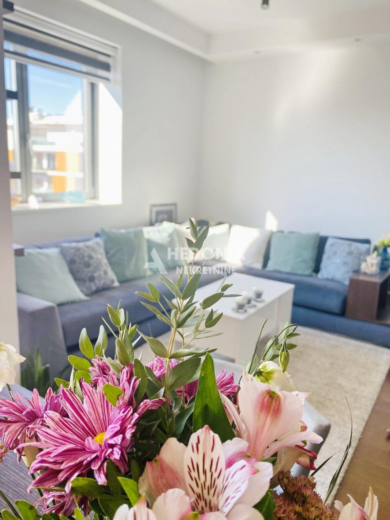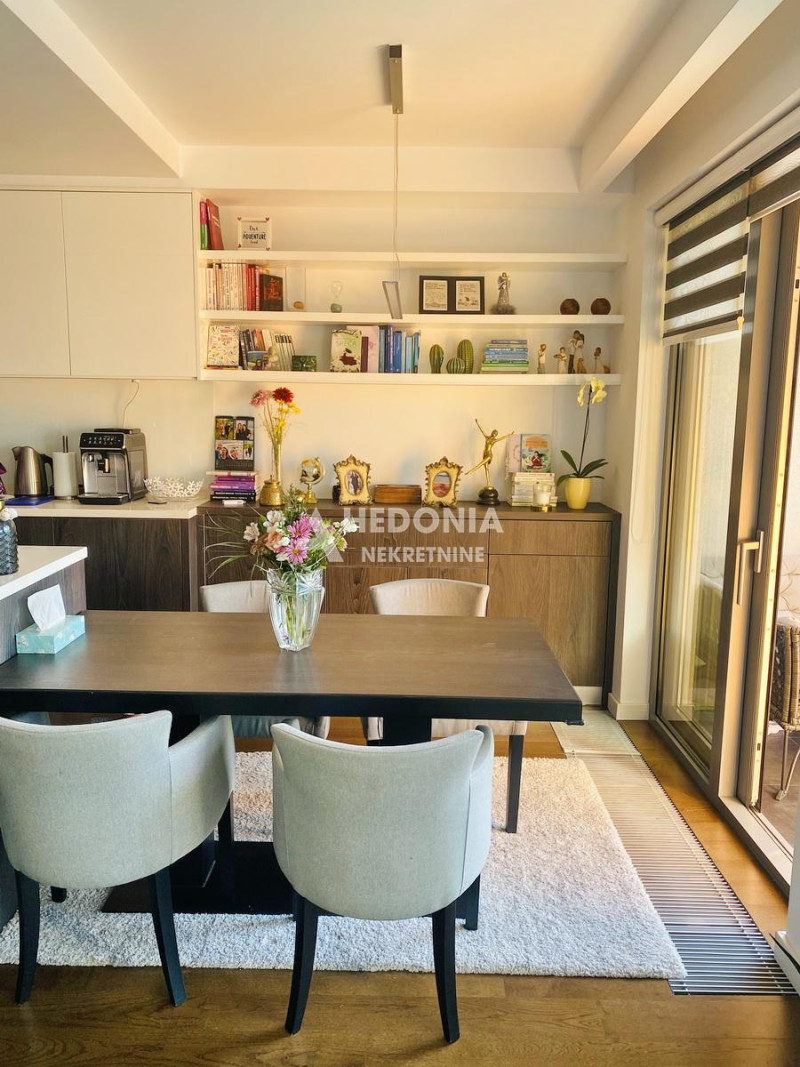 Stan je po strukturi dvosoban, noviji i luksuzan. Sastoji se iz ulaznog hodnika, dnevno kuhinjsko trpezarijskog dela, spavaće sobe, kupatila i terase. Izdaje se namešten. Mogućnost zakupa garažnog mesta po ceni od 150 EUR.