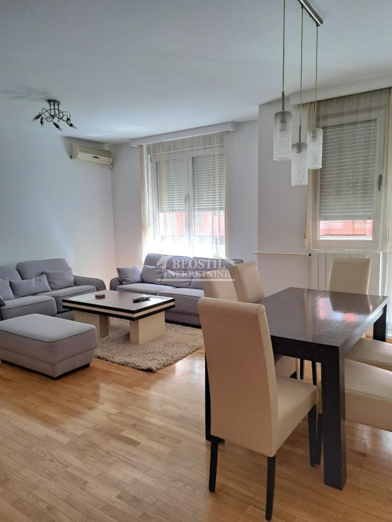 Prostorije: predsoblje, dnevna soba sa trpezarijom, kuhinja, dva kupatila,degažman, dve spavaće sobe, ostava i lođa.