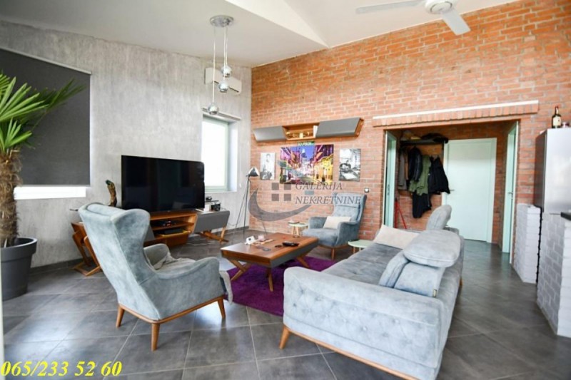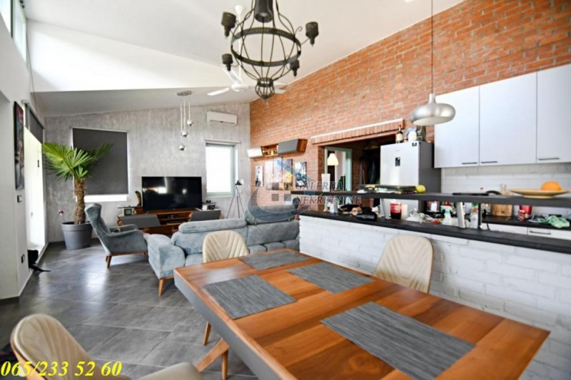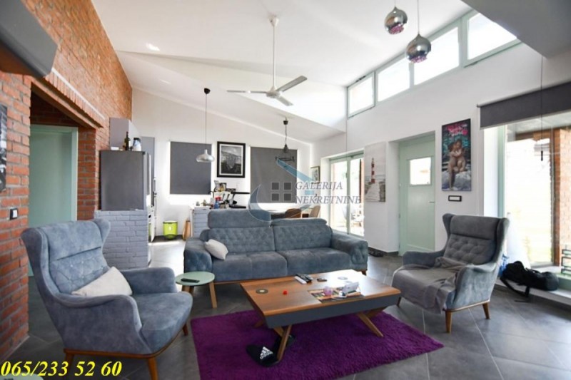 Kuća je građena po visokim ekološkim standardima, zidana ciglom (sendvič sistem gradnje), austrijska drvena stolarija, prozori sa ugrađenim antisol staklima, estetski i funkcionalno dovedena do savršenstva. Kompletnog enterijera u granitnim pločama i cigli, grejanje je etažno (podno na toplotnu pumpu), po strukturi je trosobna, svaršenog rasporeda prostorija i komforna. Idealna orijentisanost kuće pruža obilje dnevnog svetla. U kuću se ulazi preko zastakljenog trema koji služi i kao prijatno mesto za odmor. Centralni deo kuće je prostran (open space) gde dnevni boravak deli prostor sa trpezarijom i kuhinjom.Takođe su tu dve komotne spavaće sobe kao i kupatilo. Sa zadnje strane kuće je manja ostava. Ugrađeni su solarni paneli koji zadovoljavaju potrebu za električnom energiom. Dvorišni deo se sastoji od zatvorenog bazena sa turbinom za plivanje u mestu, kao I sistem zagrevanja u hladnom periodu, koji se u letnjim mesecima otvara u čijem je sklopu sauna. Ceo plac je ograđen, oplemenjen sa puno zelenila.