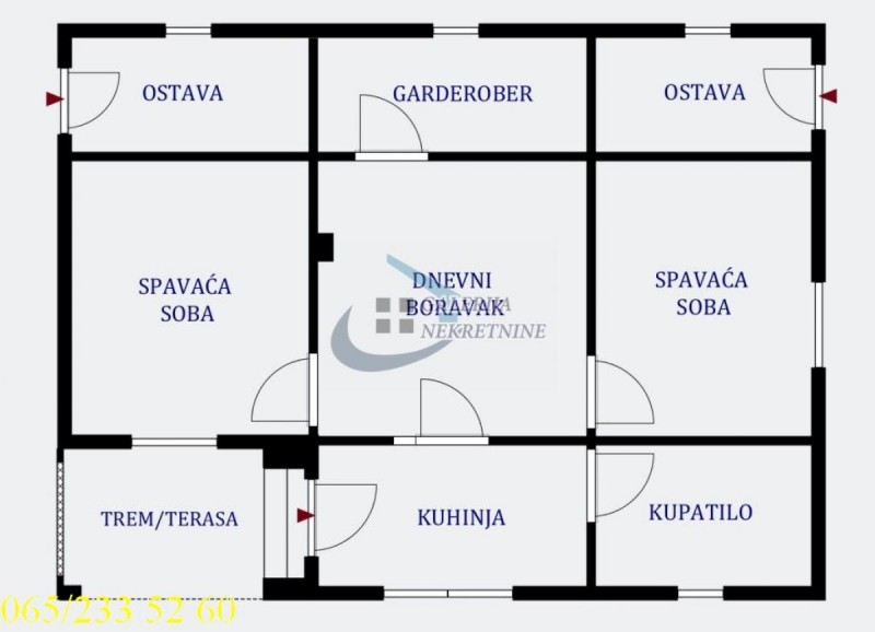 Od prostorija: kuhinja, dnevna soba, dve spavaće sobe, garderober, kupatilo, dve ostave, trem/terasa.