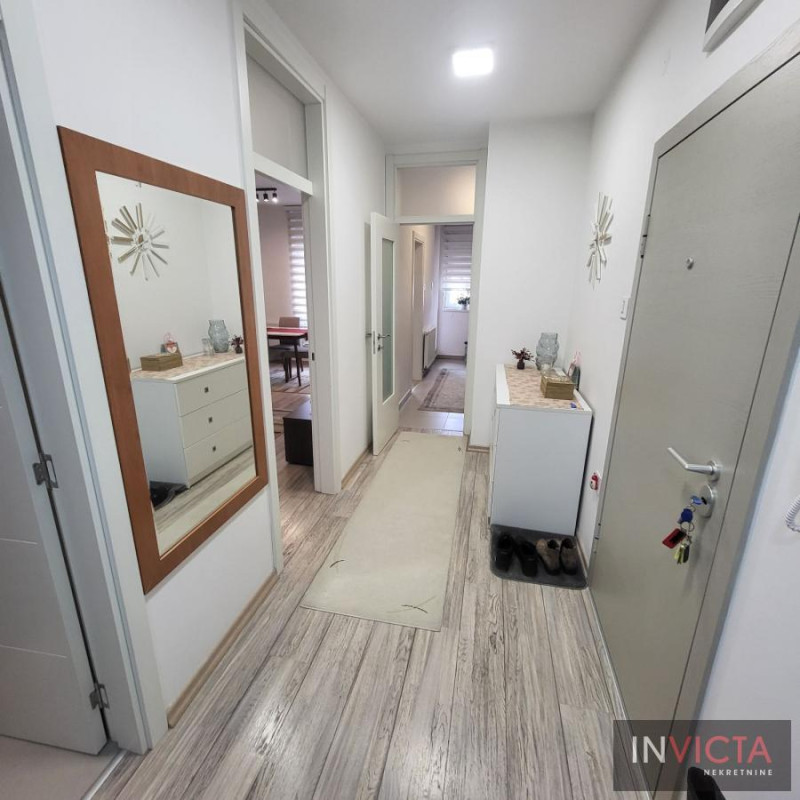 Trosoban noviji stan, potpuno opremljen, funkcionalnog rasporeda sa garažnim mestom u suterenu objekta, na odličnoj lokaciji, u neposrednoj blizini kako dunavskog keja-šetališta, tako i na svega 10-tak min laganog hoda od centra grada i pešačke zone, Riblje pijace. U blizini su i osnovna škola, vrtić, gimnazija. Dvostrane orijentacije, svetao i osunčan. Dve spavaće sobe sa vezom ka terasi, , prostorija za garderobu, poseban vešeraj sa mašinama za pranje veša,odvojena kuhinja i dnevni boravak povezan takođe sa drugom terasom. Stan je opremljen svom potrebnom belom tehnikom. Grejanje je centralno gradsko i plaća se po utrošku, samo u grejnoj sezoni. Useljiv je od 01.05. uz obavezan depozit. Izdaje se isključivo ozbiljnoj klijenteli na duži vremenski period. Posrednička provizija u visini od 50% od ugovorene mesečne zakupnine. Broj u Reg.posrednika 2107.
